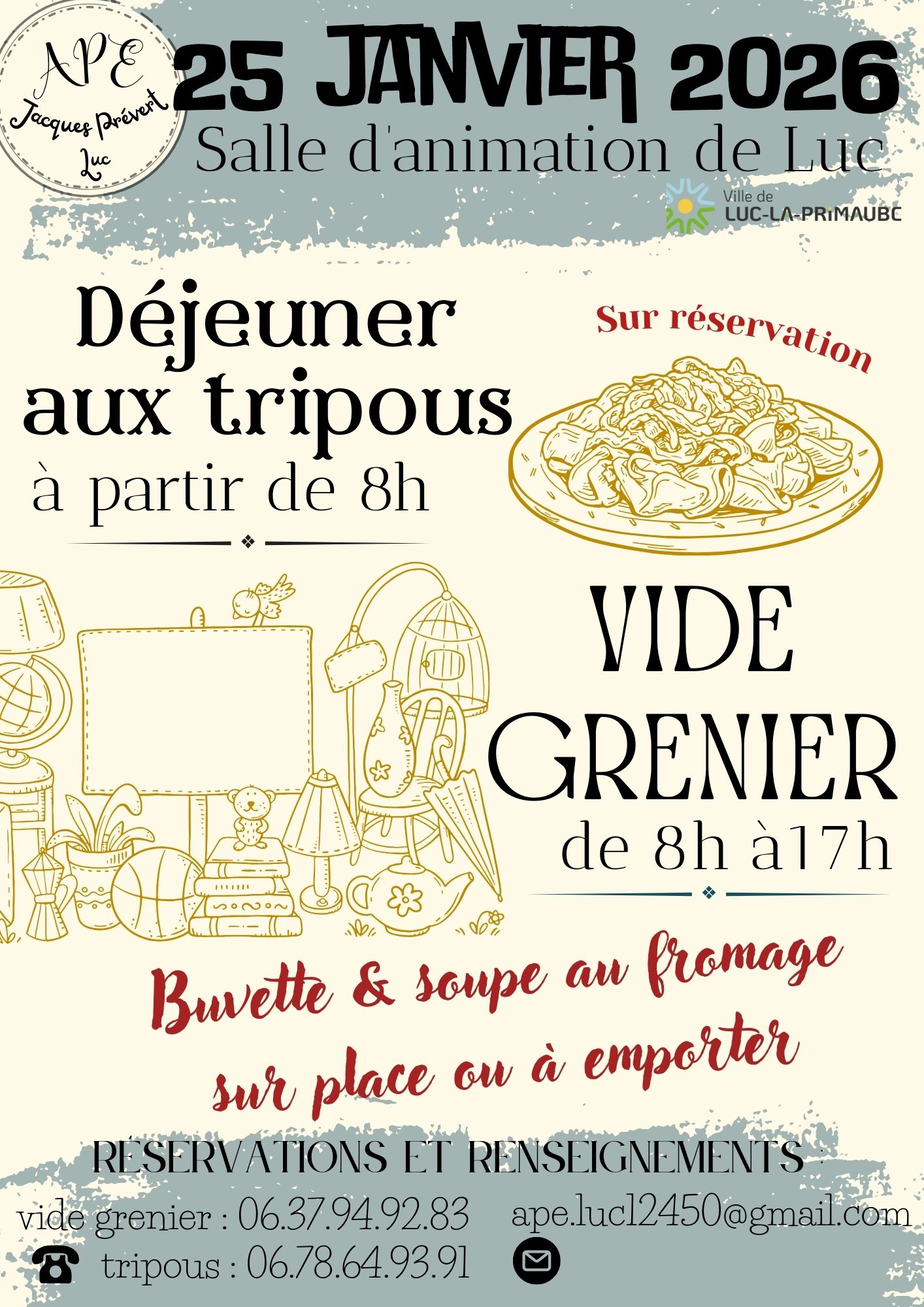 L’APE de l’école Jacques Prévert organise un Déjeuner aux tripous et un Vide grenier dimanche 25 janvier à l’Espace d’Animation à Luc.