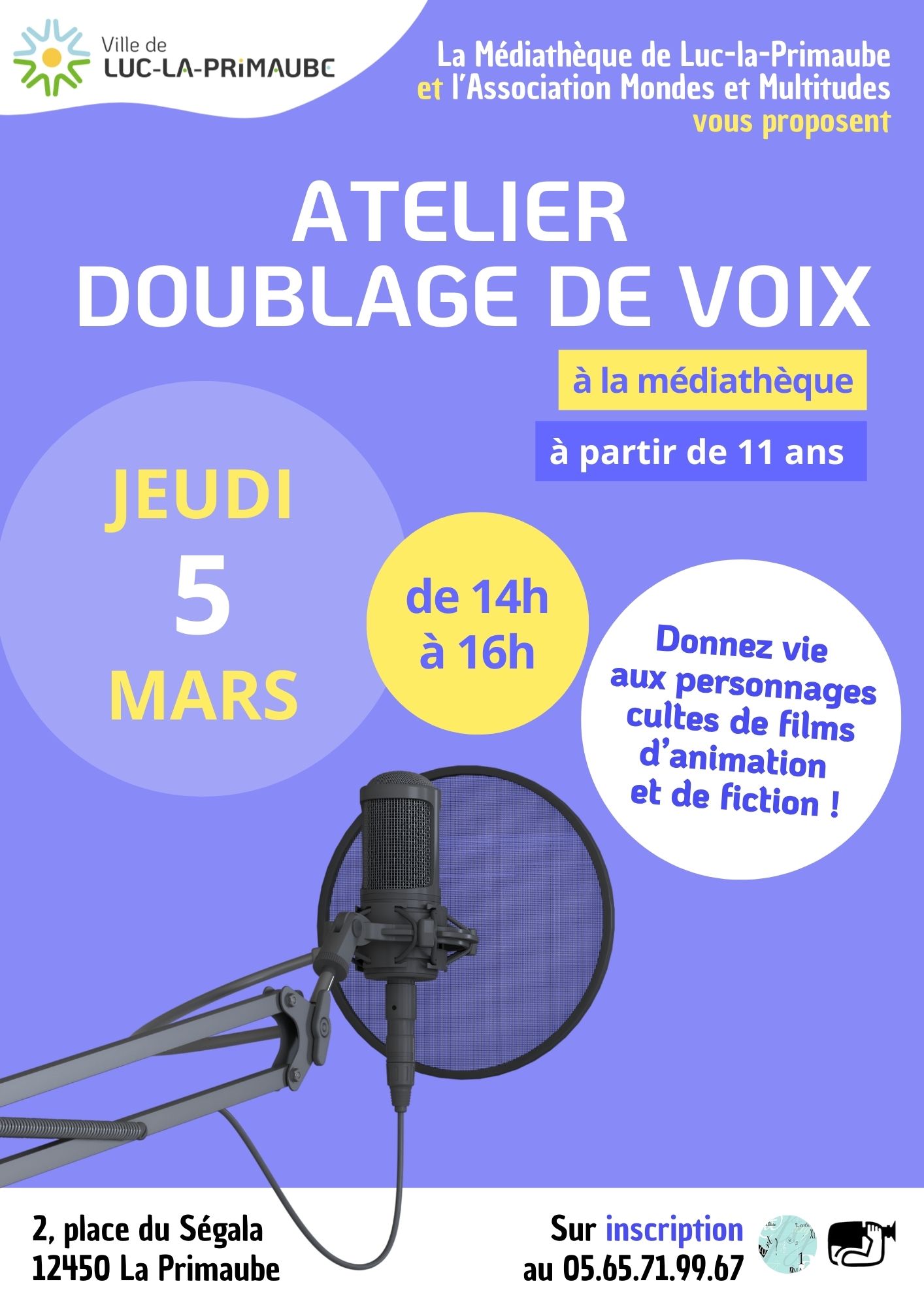 Pendant ces vacances, le 5 mars de 14h à 16h, l’association Mondes et Multitudes animera à la Médiathèque de Luc-la-Primaube un atelier Doublage de voix pour donner vie aux personnages culte de films de fiction et d’animations !