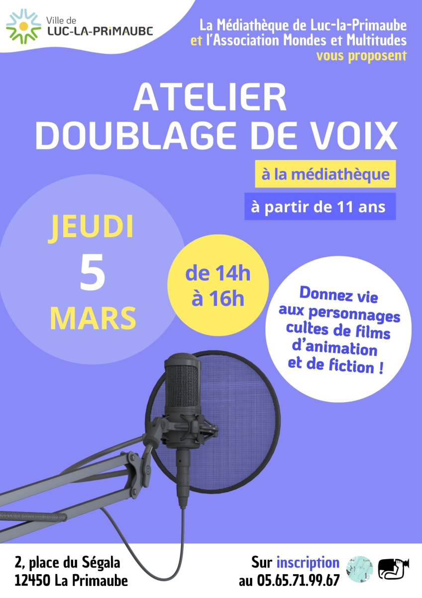 Pendant ces vacances, le 5 mars, l’association Mondes et Multitudes animera à la Médiathèque de Luc-la-Primaube un atelier Doublage de voix pour donner vie aux personnages culte de films de fiction et d’animations !