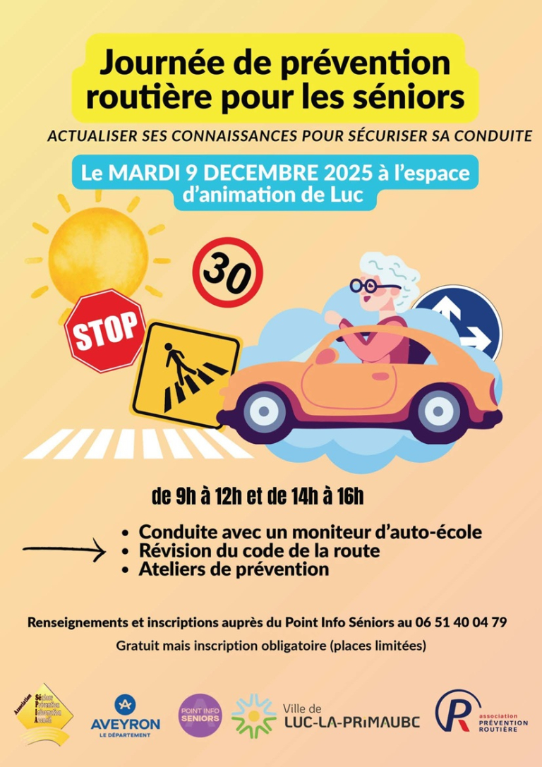 Le CCAS de la Ville de Luc-la-Primaube en partenariat avec le Point Info Seniors organise mardi 9 décembre 2025 une journée de prévention routière à destination des seniors, à l’espace d’animation de Luc de 9h à 12h et de 14h à 16h. L’objectif de cette journée est l’actualisation de ses connaissances pour sécuriser sa conduite.